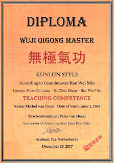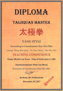 Michel is opgeleid op de traditionele manier. In de oude traditie mag iemand pas lesgeven na 10 jaar intensieve training en na een intensieve opleiding, waarin je het lesgeven leert door te assisteren en grondig en diepgaand de toepassing leert van de levensfilosofie en energieleer. Zo heeft de leraar veel kennis, vaardigheid en ervaring. Michel begon in 2008 en geeft les sinds 2018. Hij volgde lessen bij Peter t/m 2022. De diploma's die Michel behaalde staan op de website van Michel. Twee daarvan (de belangrijkste) staan onderaan dit blog.